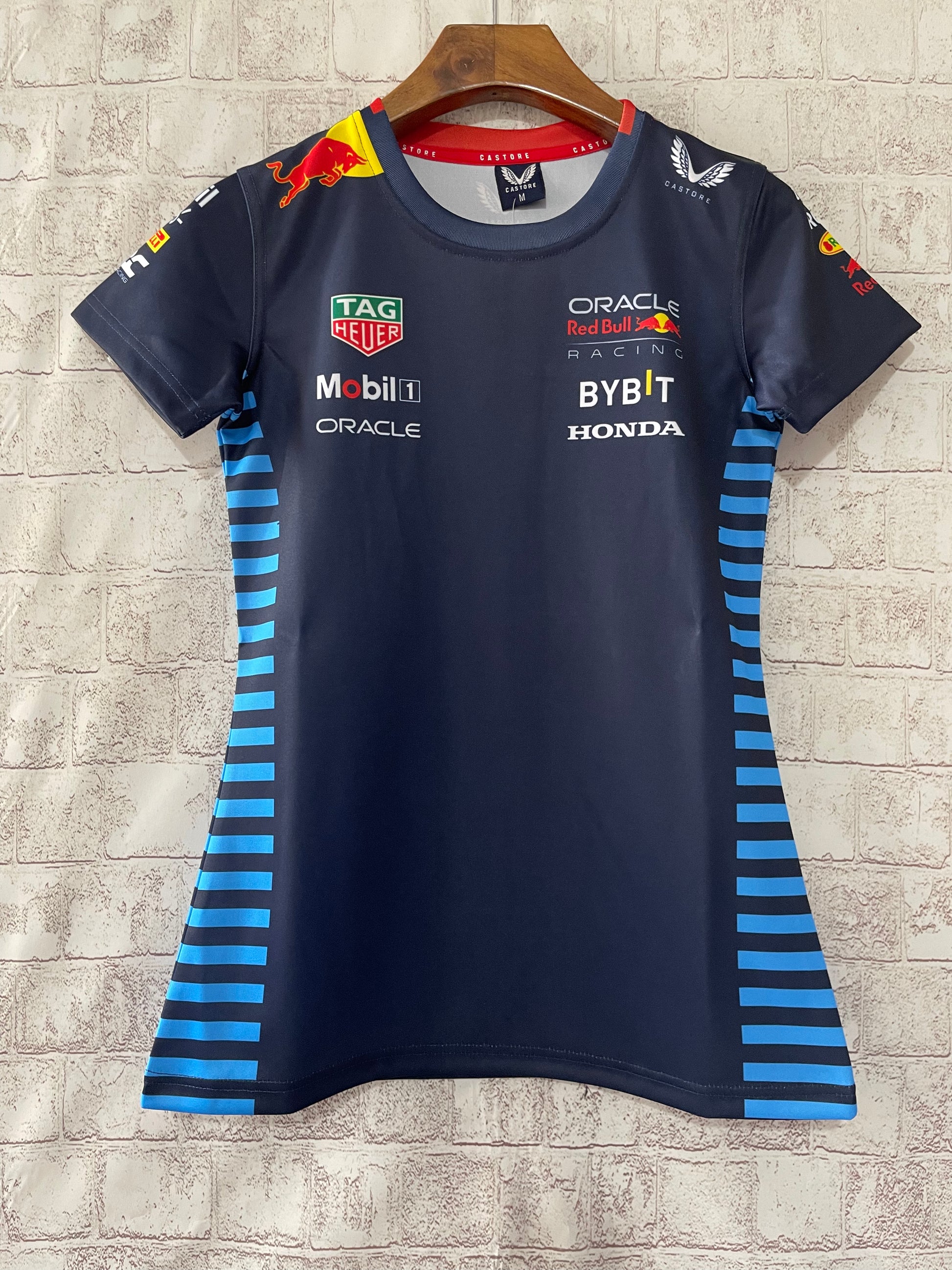 Support the Red Bull Racing F1 team in style with this 2024 Women’s Team T-Shirt. Designed for female fans, this sleek navy tee features bold Red Bull Racing branding along with sponsor logos from Tag Heuer, Mobil1, Oracle, Bybit, and Honda. The vibrant blue stripes on the sides and shoulders add a dynamic edge to the design, reflecting the energy and speed of the team.